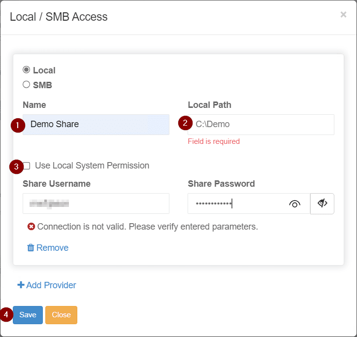 Choose a name for your local share, enter the path for the local share, and choose to either use the local system permissions or enter service account information and select Save.