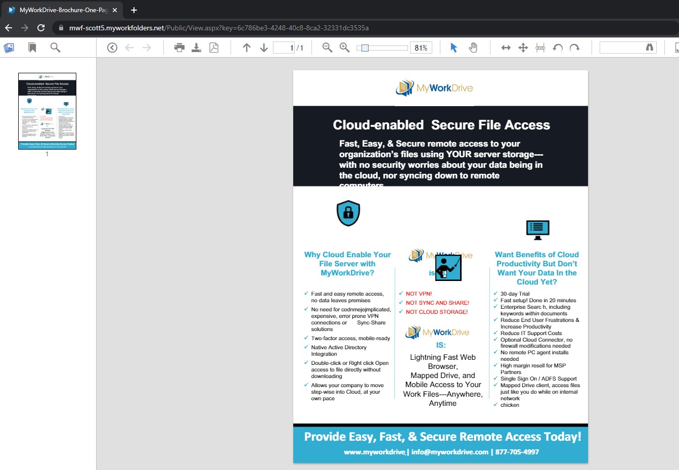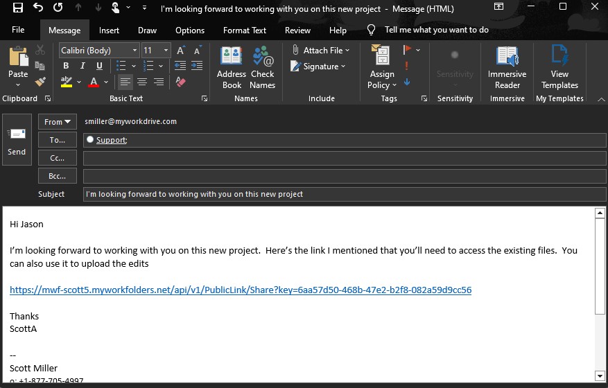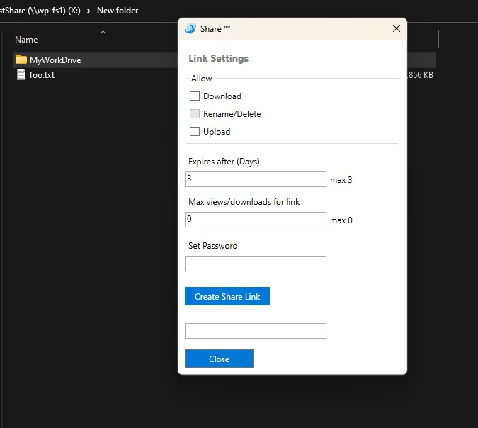 Starting with version 6.4, MyWorkDrive includes a new feature, Public Sharing, which allows users to securely collaborate with people outside their organization, such as business partners, vendors, clients, or customers, without requiring them to have a MyWorkDrive account. Users are able to generate a publicly accessible link to share via email, chat, etc.