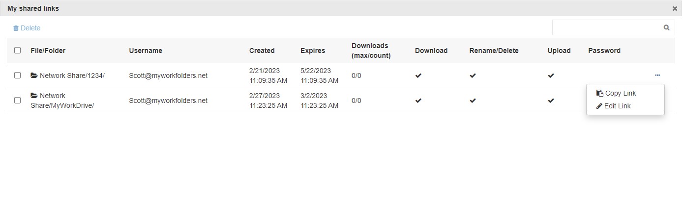 Delete After Days - This is the maximum number of days a link will be retained before being deleted. It is longer than the chosen expiration, as a user may choose to re-activate a link when it expires. Users are provided a list of Public Share links and the ability to manage them from the web client.