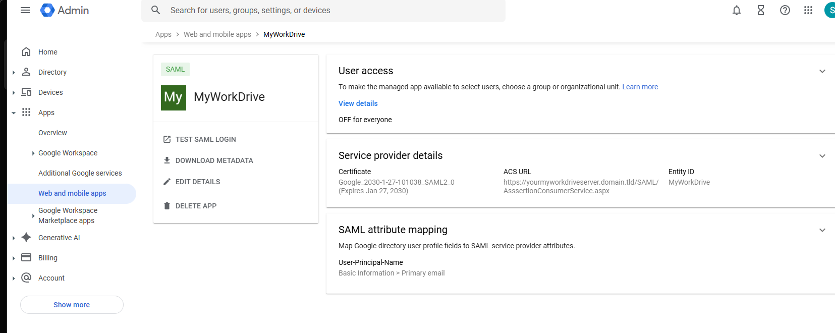Note the Google Identity Provider Details screen offers a Metadata download. This is not used with MyWorkDrive.