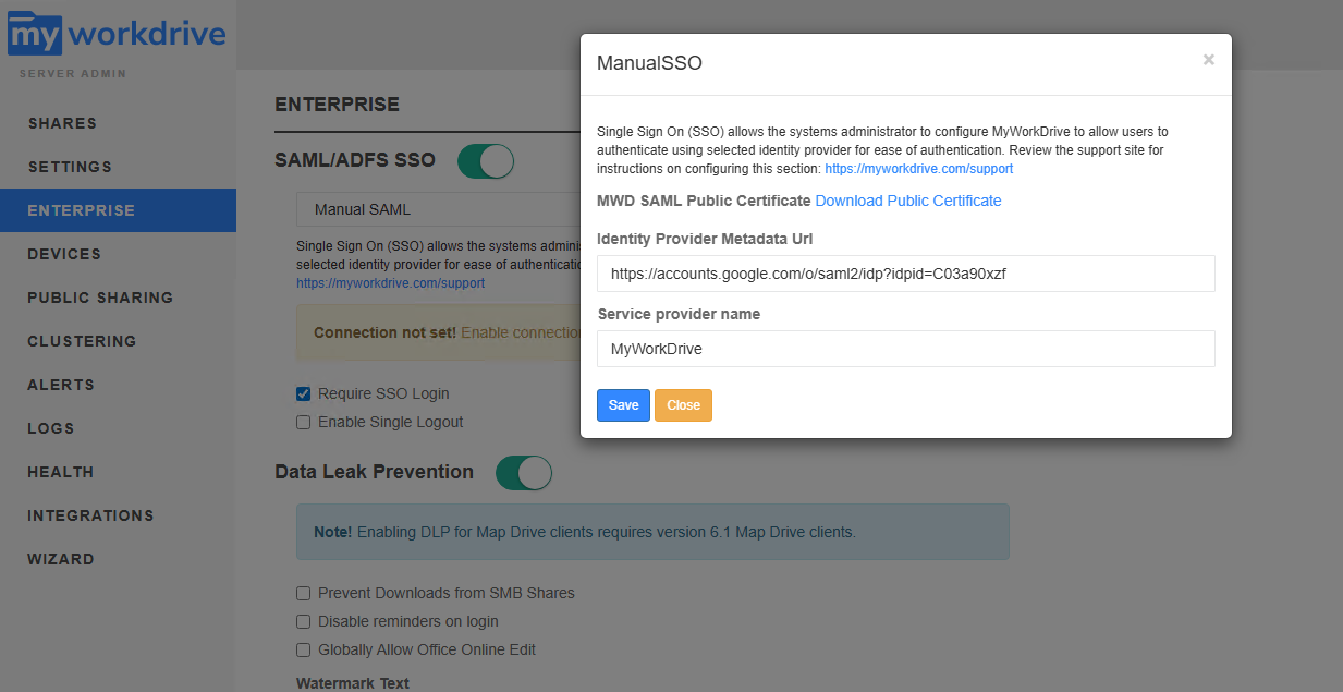 Google SAML authenication is configured in MyWorkDrive using the SAML Single Sign on Manual Configuration option.