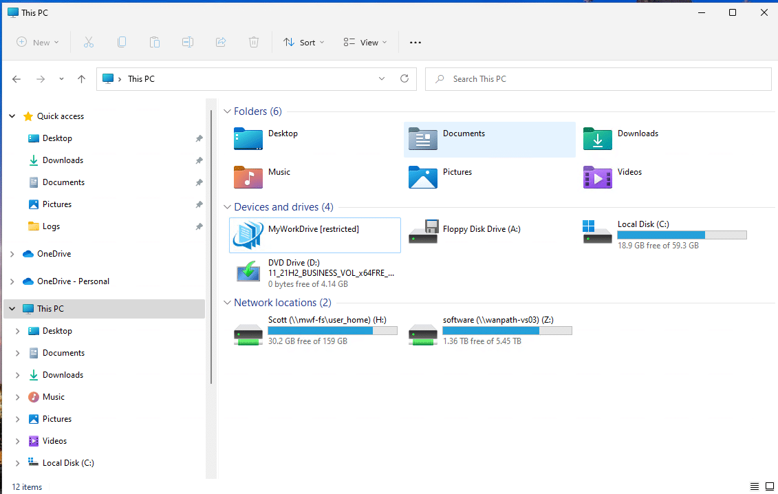 When installed, the MyWorkDrive (restricted) icon will appear in the devices and drives section of This PC in Windows Explorer.
