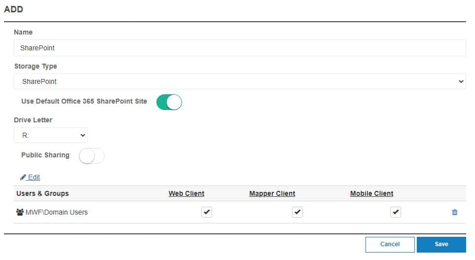 With SharePoint Access configured in Integrations and enabled in Settings, create a share using SharePoint as the Storage Type and select the users or groups who are assigned access in MyWorkDrive.