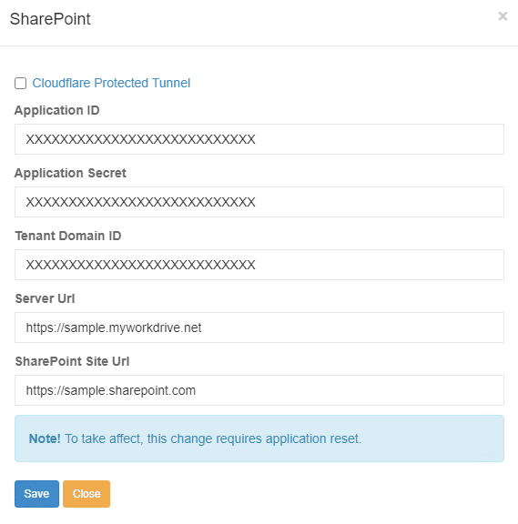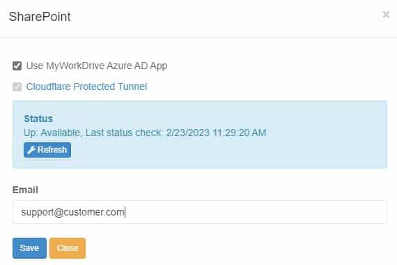 The default option utilizes our MyWorkDrive Cloudflare Integration and our shared MyWorkDrive Azure AD App Registration. With this default option, the user does not need to create their own Azure AD App Registration or set up a public web address for the internal MyWorkDrive server. To enable SharePoint access, simply enable our default option in Integrations > Storage Providers > SharePoint.