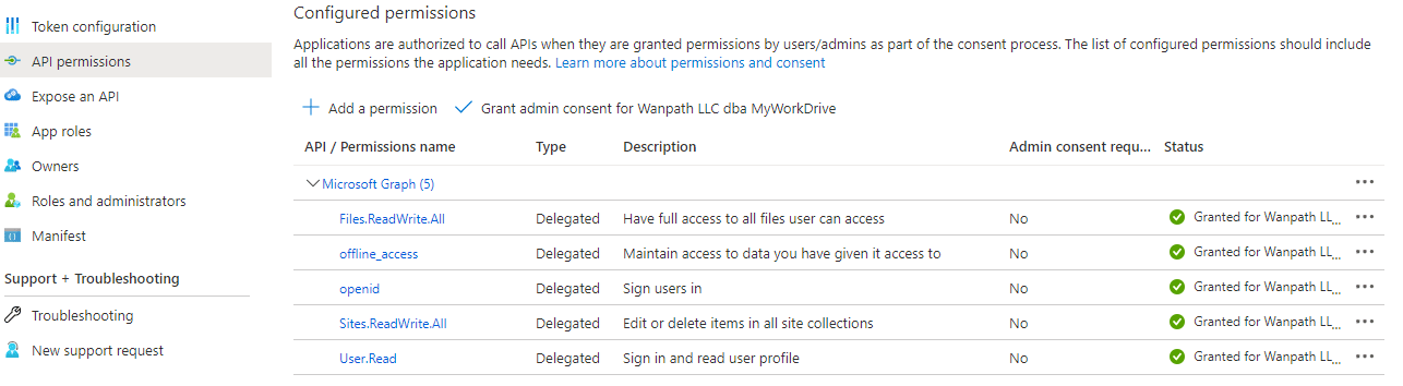 Click API permissions > Add Graph API Delegated Permissions > Microsoft Graph > Files.ReadWrite.All > offline_access > openid > Sites.ReadWrite.All > User.Read