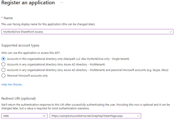 Provide a _Name_, _Supported Account Type_, and include your public MyWorkDrive URL with the subsite "/GraphApiTokenPage.aspx".