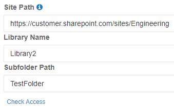 The default option will create a share and use the company's default SharePoint site in Microsoft Office 365. Optionally, select and add a custom site using the URL of the site and optionally specify a library and/or subfolder. Click Check Access to validate the site.