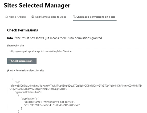 Optionally, check app permissions on a site to confirm after entering the site URL.