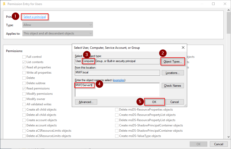 Click "Select Principal". "Computer" must be available as an "Object Type". Then select your MWD server and select "OK".
